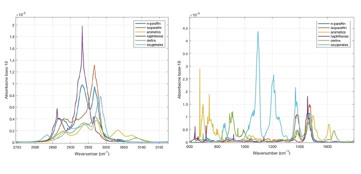 The researchers built a data set comprising infrared spectra, octane numbers, and molecular properties for the main components of gasoline, including paraffin, isoparaffin, olefin, naphthene and aromatic hydrocarbons. From this, they produced composite spectra for 148 different hydrocarbon blends.